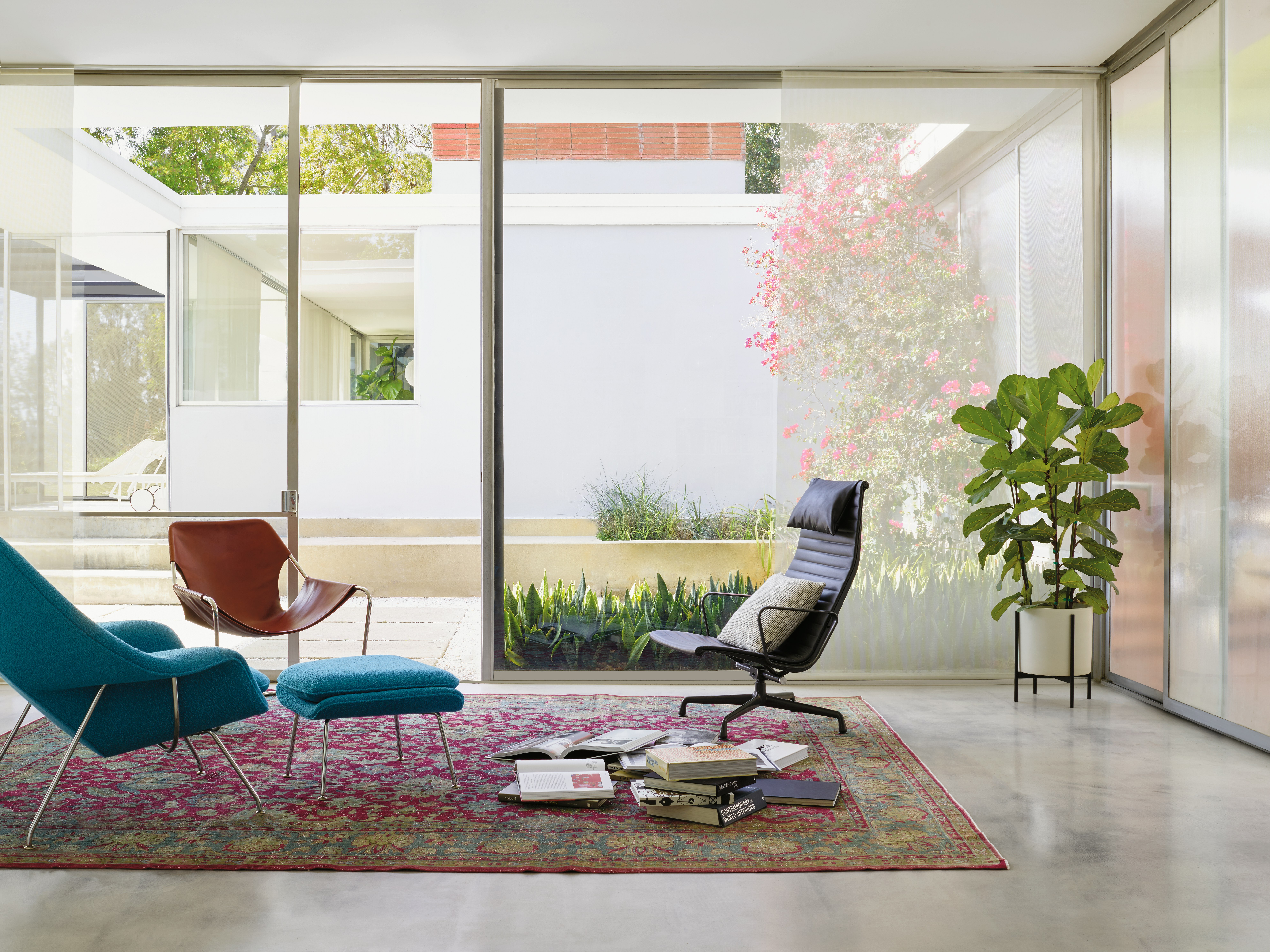 The Eames Aluminum Group Collection (1958) began as a special project for Eero Saarinen and Alexander Girard, who needed seating for a home they were designing for industrialist J. Irwin Miller in Columbus, Indiana. The pair asked the Eameses to design light, mobile leisure chairs. At the time, Charles and Ray were exploring ways to use aluminum, which had been strengthened, refined and made more affordable since WWII. So, they constructed a lightweight, die-cast aluminum frame and set a sling in it – a “sitting pocket,” as they called it, which subtly conformed to the body’s shape. This completely new type of seat marked a departure from the idea of a chair as solid shell.