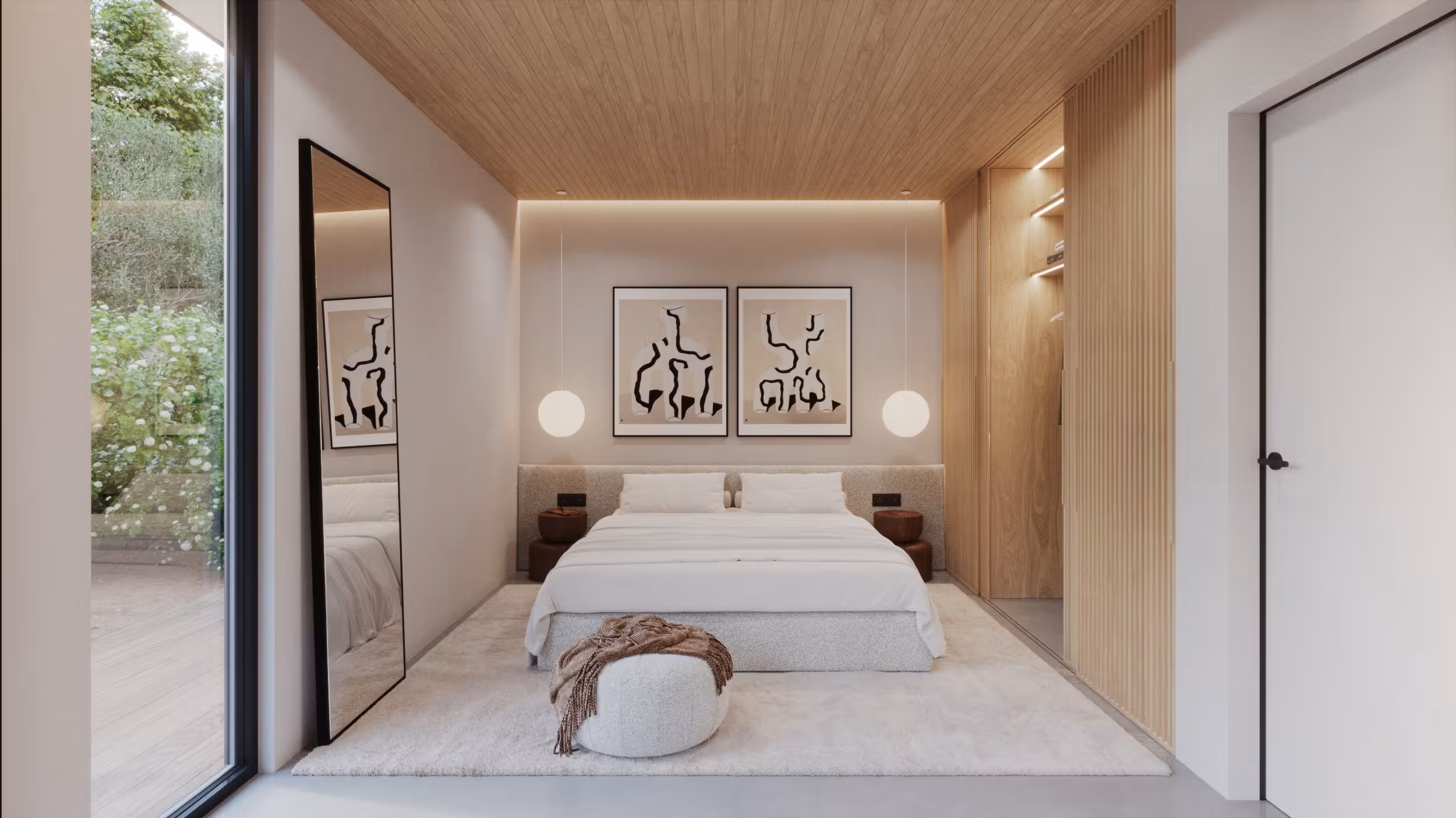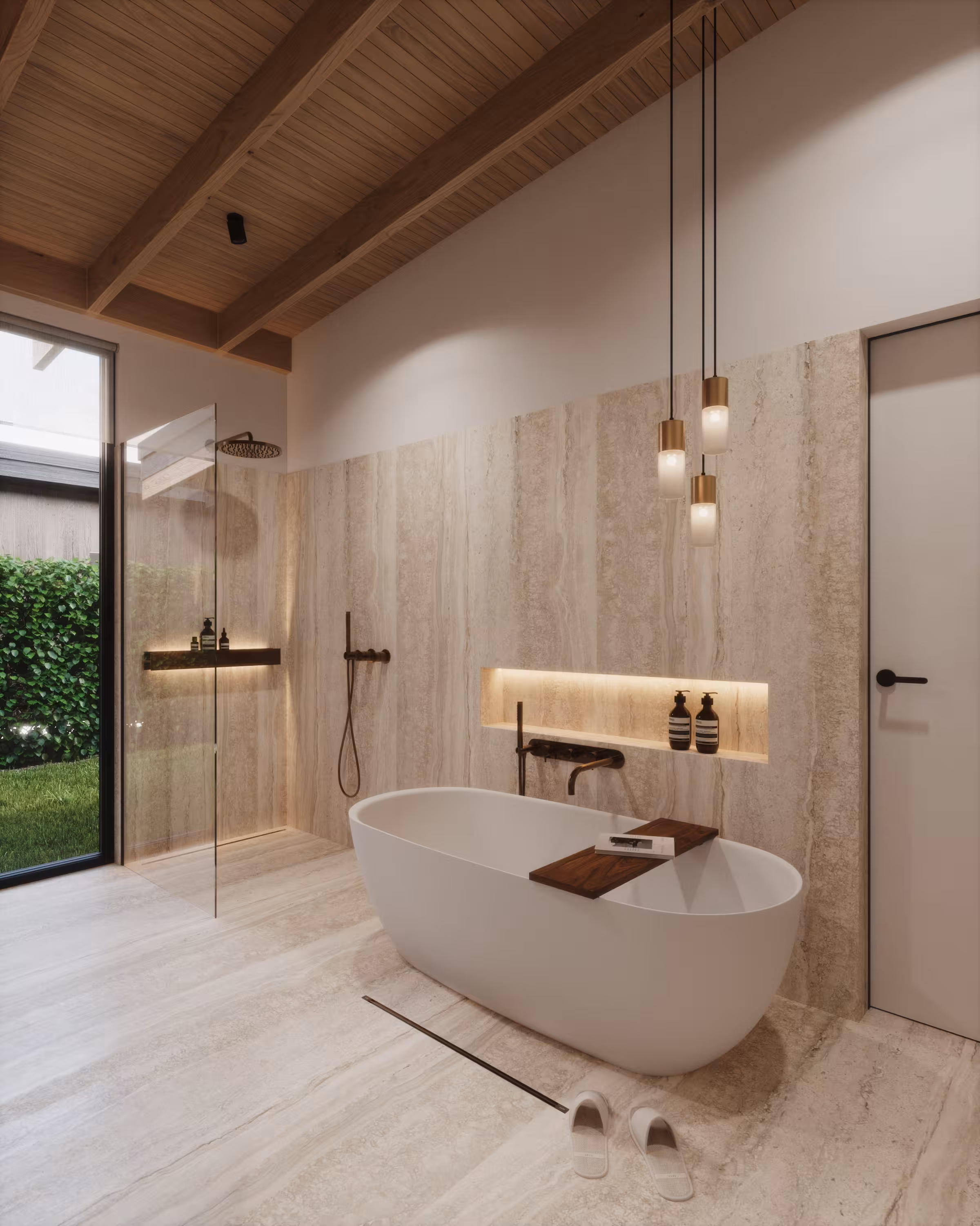 Slatted wood panels are a hallmark of mid-century modern design due to their ability to balance aesthetics and functionality. The use of natural materials combined with clean lines and minimalism, creates a sense of visual interest and texture that allows for light and ventilation to connect with the outdoors.